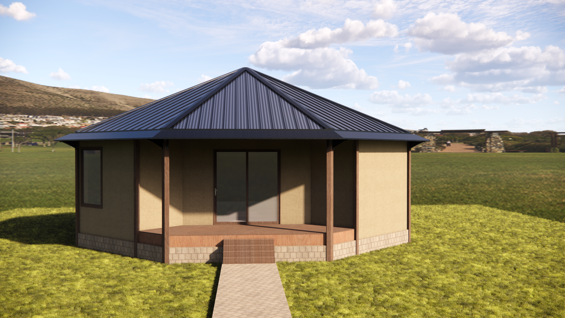 The 32’ octagon plan with 99 SF covered patio is 2 bedroom, 1 bathroom with large open kitchen and great room.